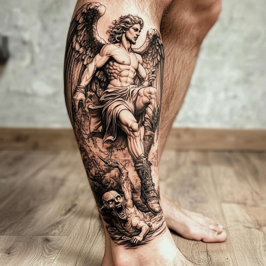 Men’s angel tattoos often lean towards bold and dramatic designs. Guardian angels with powerful poses wings in motion or detailed armour are common themes. These tattoos can symbolise strength resilience and spiritual protection making them a popular choice for those who want a design that exudes both meaning and masculinity.