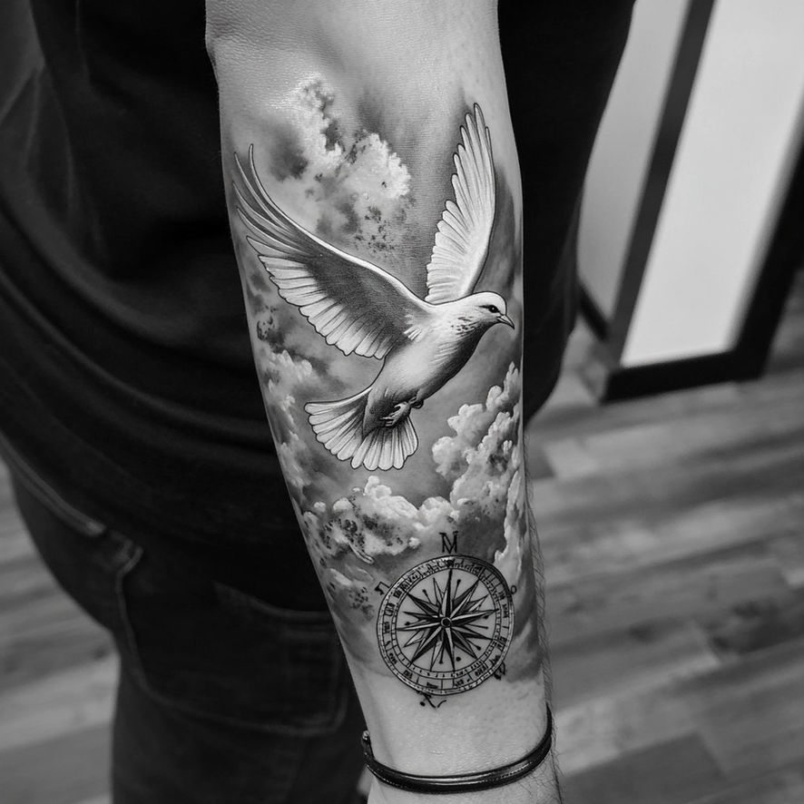 A realistic dove tattoo can be deeply moving, with soft feathers, outstretched wings and gentle shading. Black and grey realism works well for solemn, reflective tattoos, while colour versions can add vibrancy and warmth. These pieces often need more space — the upper arm, back, or chest — to allow for detail and flow.